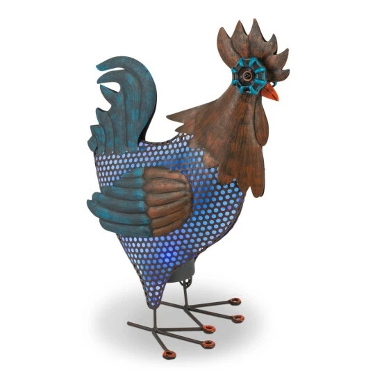This Solar Lighted Metal Rooster from The Gerson Company stands 17.72″ tall and is illuminated by a blue LED light that will come on as the sun goes down. Detailed scroll metal work gives this garden and yard dΓ©cor an authentic look with illuminated cut-outs and rustic brown and blue finish. Place the statue in direct sunlight for the optimal charge throughout the day.