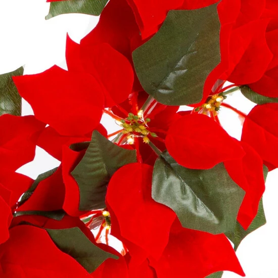 This beautiful lighted poinsettia wreath from Gerson has 15 flowers, each with 3 micro led lights as the Pistils. This plant has a total of 45 LED lights intertwined in its 15 Poinsettia flowers. This wreath will give your home an elegant look, amazing all who see it!