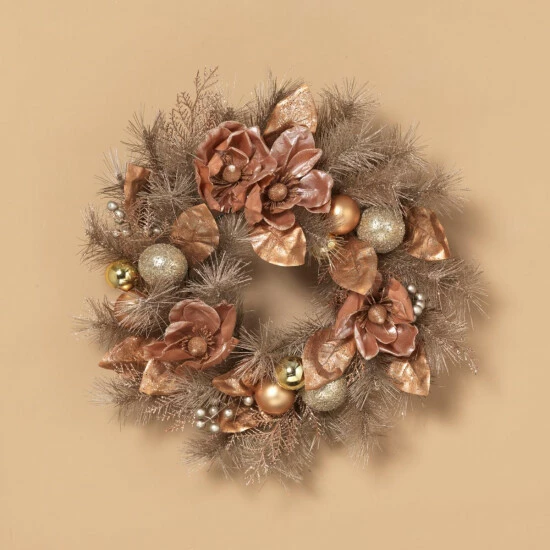 Deck your halls with boughs of pine and magnolia! Exquisitely designed, this unique 24″dia. champagne-colored Gerson holiday wreath is adorned with magnolia leaves, champagne and rose gold colored ornaments and berries. This glitz and glam wreath can be a statement piece throughout the season.