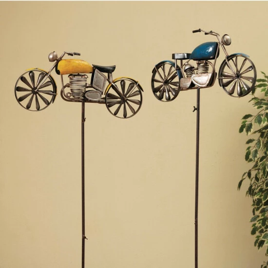 Add that special touch of aesthetic charm to your garden setting with this attractive set of 2 metal motorcycle wind spinners. Each antique-styled wind spinner comes in two assorted colors: One with black frame and a yellow gas tank and the other with black frame and a blue gas tank, both with charming black wind spinner wheels. Arranged separately or together, these charming antique-styled motorcycle wind spinners will uniquely enhance your garden scene year-round or make a delightful gift for friends, family or that special someone.