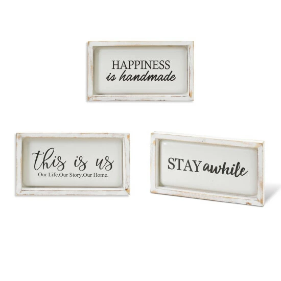 This artfully designed and trendy wall hanging set is just what you need to accent your own decorative style. These stylish wall hangings are made of real wood frames and stamped metal in exquisite detail. The background is a creamy white, with a scrolling message. With a 3-dimensional effect, each one is both modern and artful, and they’re framed and ready to hang together for a touch of love and family in your home decor.