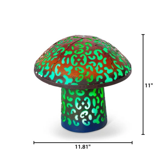 Capture the the imagination of your family and neighbors with this solar powered metal mushroom in your garden. Standing 11″ tall, it will tower over low blossoms and accent taller ones with a bright blue hue, illuminated by an LED light that will come on as the sun goes down. Detailed metal work and gives this garden decor an authentic and colorful look with with illuminated cut-outs and gradient color finish.