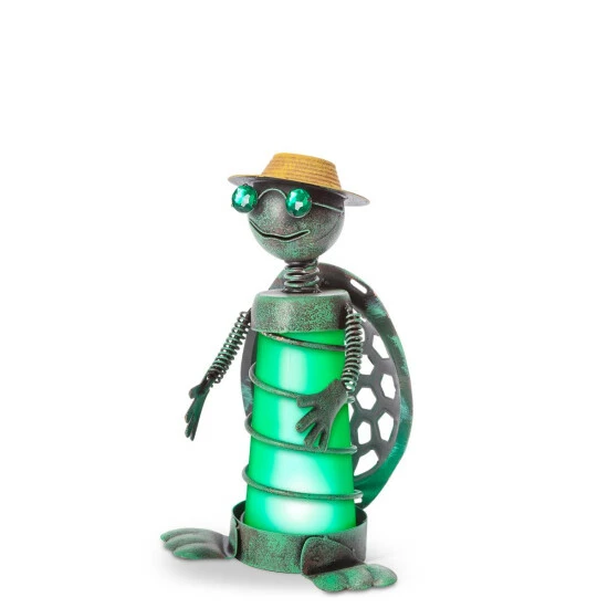 Capture the energy and beauty of sunshine with these solar powered metal springer frog and turtle in your garden. Standing 14″ tall, they will tower over low blossoms and accent taller ones with a bright green or blue hue, illuminated by an LED light that will come on as the sun goes down. The metal springer, hand painted metal hat and jeweled eyes gives these garden garden buddies a colorful look.