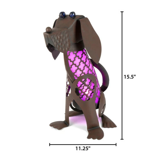 Standing 15.5″ tall, this solar powered metal dog will capture the energy and beauty of sunshine and accent your garden with a bright pink hue, illuminated by an LED light that will come on as the sun goes down. The ogee metal work gives this garden decor a charming and colorful look with illuminated cut-outs and rustic brown finish.