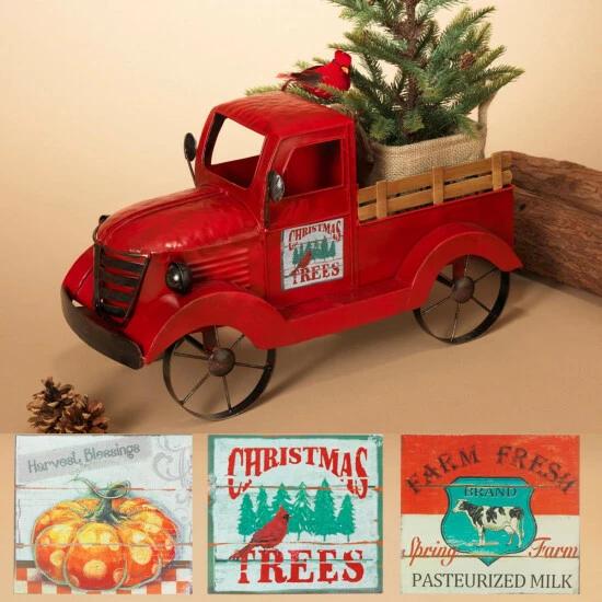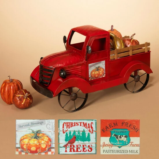 A blast from the past, this truck is a classic! Keep this out all year, by using display as is, or with the set of 3-styled door magnets that make your truck seasonal. Pumpkins say “Harvest Blessings”, Christmas trees decorate “Christmas Trees”, and a cow is on “Farm Fresh”. This red truck has an antique finish with an open cab and wood panels on top of the bed. More classic features are red fenders and running board, a large burnished grill, headlights and large spoke wheels. Fill the bed with everything from spring blossoms to hay bales to accent your home all year.