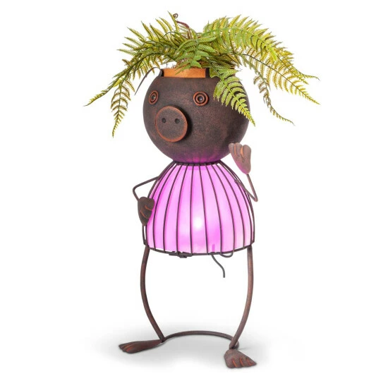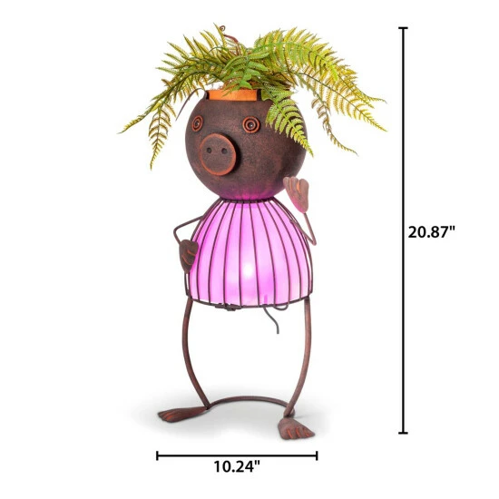 Add personality to your garden, porch or patio with this solar powered metal pig pot head. Standing 20.87″ tall, it will tower over low blossoms and accent taller ones with a bright pink hue, illuminated by an LED light that will come on as the sun goes down. Change the personality of your pig pot head by planting different flowers or plants in the planter head. You can achieve a colorful look with the illuminated wire frame body and rustic brown finish.