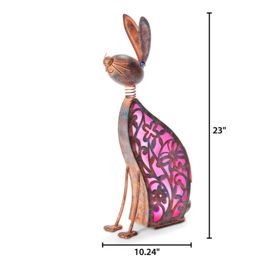Capture the energy and beauty of sunshine with this solar powered metal rabbit in your garden. Standing 23.03″ tall, it will tower over low blossoms and accent taller ones with a bright pink hue, illuminated by an LED light that will come on as the sun goes down. Detailed metal work gives this outdoor decor a colorful look with with illuminated cut-outs and copper patina finish.