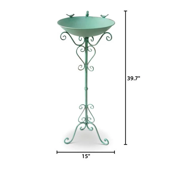 Your garden or yard dΓ©cor will spring to life with this beautiful, antique-styled 39.7″ tall birdbath. Artfully-crafted with a an antique green finish, this attractive and functional birdbath has deep bowl shaped basin featuring two small birds sitting on the bowl. Intended for outdoor year-round use, this stunning birdbath has a sturdy 3-prong base with elegant scroll accents.