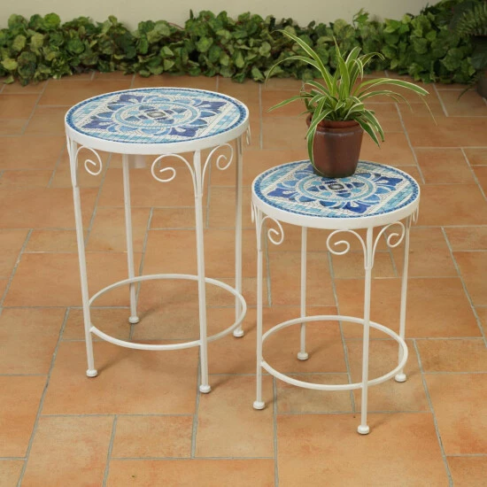 Brighten your outdoor living space with these beautiful blue and white mosaic tile accent tables or plant stands. The mosaic tile is hand made and is laid on delicate white round plant stands in two heights for added interest. With added scroll work, these plant stands are the perfect addition to your planned garden or patio space and would make a wonderful gift for family and friends.