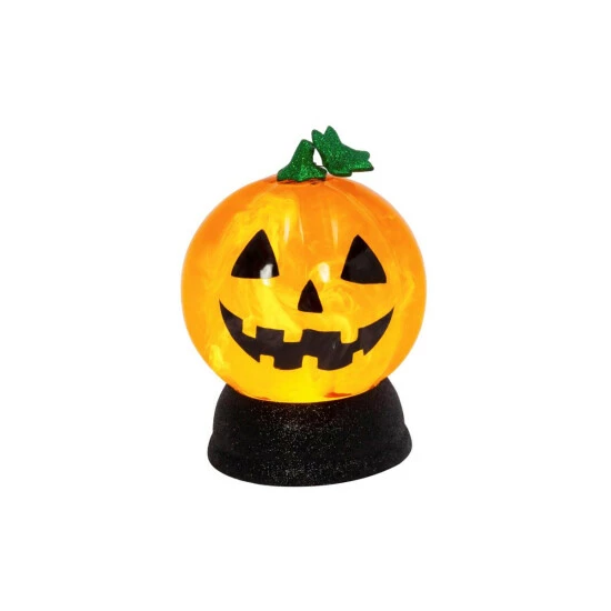 Welcome this friendly 7″ B/O lighted Jack-o-Lantern with spinning smoky water globe into your home for Halloween. Sitting on a black glitter base, topped with green stem and leaf, he is a happy guy.