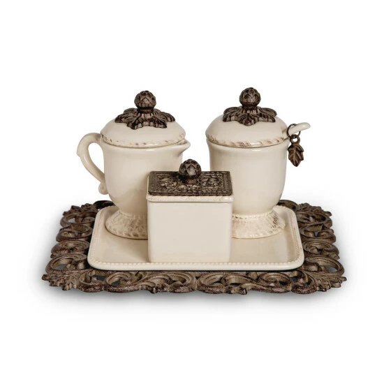 The GG Collection Acanthus Leaf Sugar & Creamer Set will elevate your afternoon tea or after-dinner coffee to special-occasion status with Old-World style. Included with this set is a small box that can hold your sweetener packets or special creamers neatly. The plate and scrolled metal tray in Acanthus Leaf motif can hold small plate of cheese, cookies or other treats to accompany your coffee or tea hour. Its fine cream ceramic and elaborate metal finials will transform your table setting into one of sheer elegance.