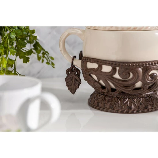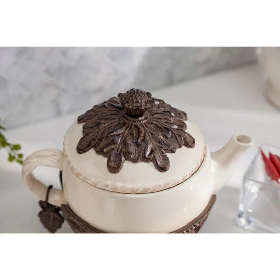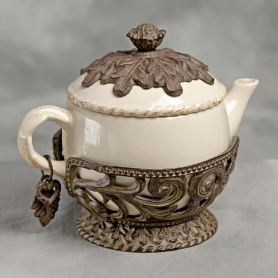 A Very Merry Un Birthday Party with this “oh so lovely” tea pot would make the Mad Hatter himself jealous. Elevate your tea time to special-occasion status and share your aromatic brews with this 32 ounce teapot. Made from a fine cream smooth ceramic, this pot is both decorative and functional, and can be removed from its base and used separately. Artfully crafted, the cast metal holder is an openwork of vintage leaf design.