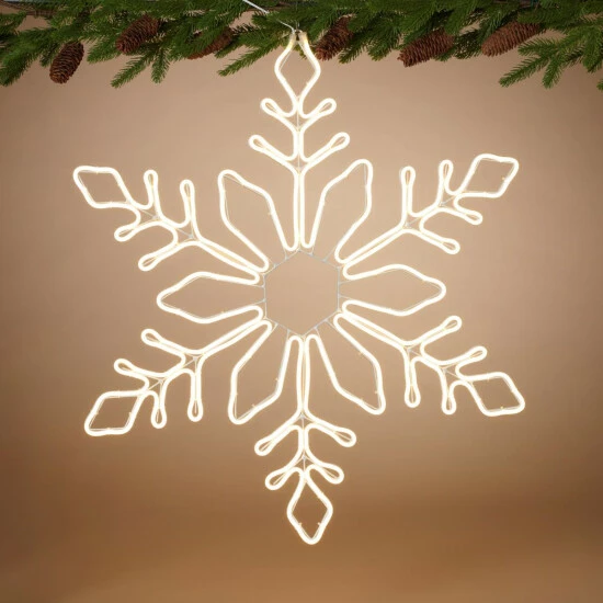 Let it snow! This stylized, gorgeous snowflake emits a cool white glow. It’s perfect for hanging from trees, porches, walls and ceilings, glowing in windows and more.