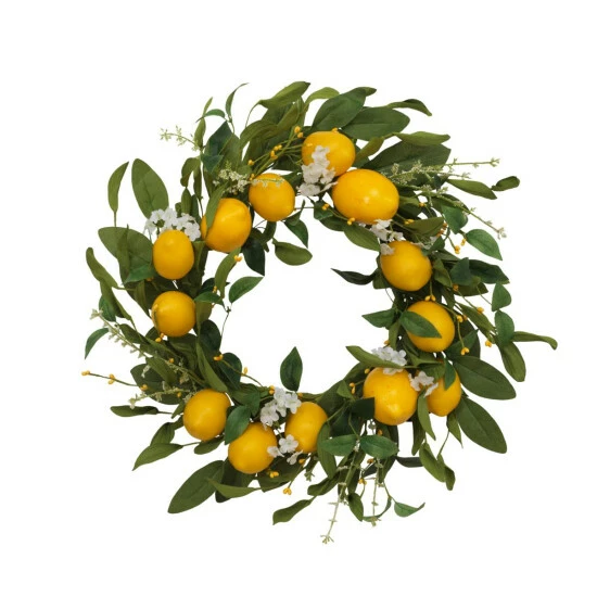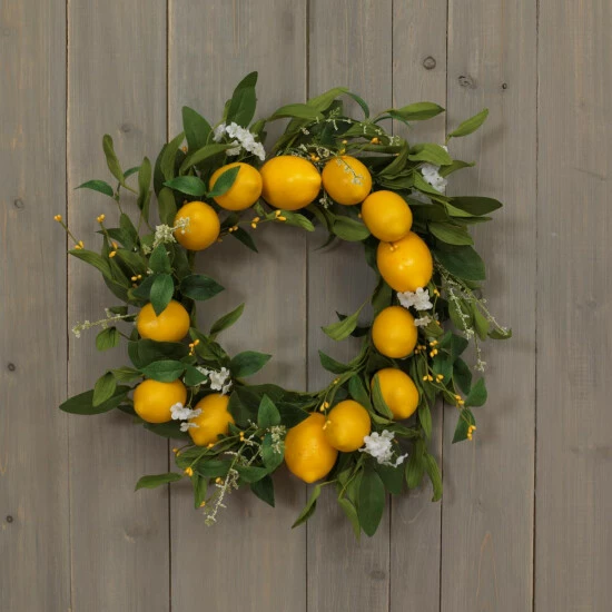 Deck your walls with boughs of fresh yellow lemons with this exquisitely designed, classic summer wreath. It incorporates full green leaves and more than a dozen realistic yellow lemons. Decorated with small white blossoms and clusters of yellow berries, it will be a festive and favorite hanging on a wall, door or your mantel this sunny summer season. This wreath will feel like you brought a touch of the bright sunshine indoors and being flame-resistant, this greenery will instantly bring a hearth-and-home feel to your decor.