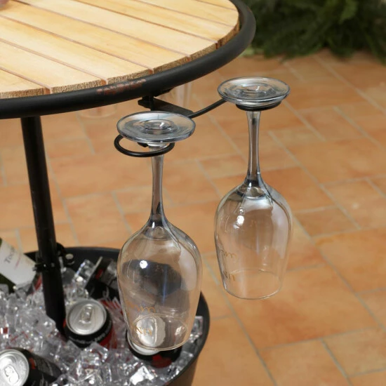Have everything you need for entertaining family and friends at your fingertips with this outdoor table. The wooden plank table top is rimmed in metal with hooks that will hold up to 6 stemmed wine glasses, while the bucket in the base below allows you to ice down and chill your wine and spirits. Perfect for entertaining on your deck or patio, it’s a great way to serve delectable munchies and snacks. Just pull up your own bar stools or chairs to enjoy the afternoon or evening.