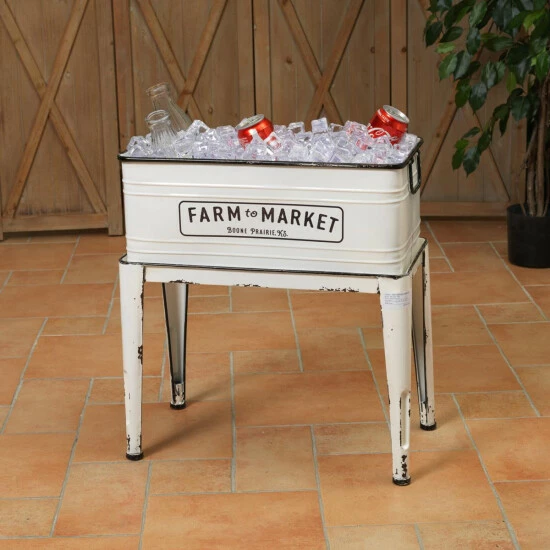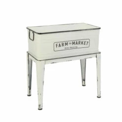 Extend your country home dΓ©cor onto your deck or patio with this lovely white enamel planter. This planter has comfortable wire handles and sits in its own matching stand. Use indoors by a sunny window for your blossoms and greenery, or outdoors for an elevated garden space. Use it as aunique cooler when you have guests to hold iced beverages for all to enjoy. The “Farm to Market” painted on the side of this planter, the vintage-style legs and antiqued black rim and accents will bring a touch of the country into your home decor to be enjoyed for many years to come.