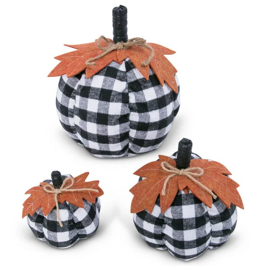 Set of 3 Black-and-White Plaid Pumpkins Harvest Décor w/Leaf Accents