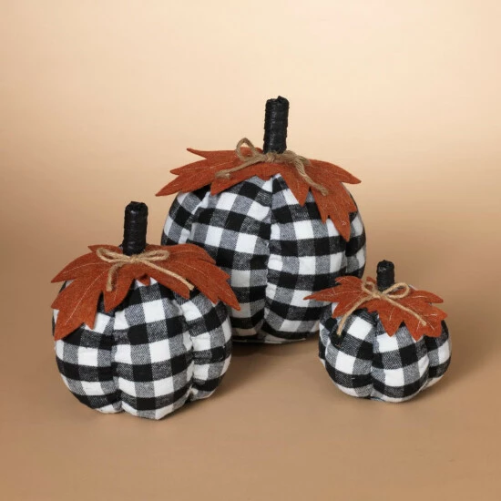 Place these adorably country pumpkins anywhere in some need of autumnal influence. Mix and match with other fall decor to create an stand-out centerpiece. Artfully made in black and white plaid with a brown leaf toppers, these pumpkins will last for several years to come. Group them together for impact, or place them separately around your home to add a some Fall fun to several different rooms in your home.