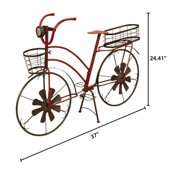 Take your favorite potted plants and flowers for a ride on this bicycle plant stand. Durably-constructed of metal in a classic, antique-styled bicycle design, this charming plant stand has wind spinner spokes on the wheels and is painted a muted red with brown accenting. It features two holders for potted plants or live flowers; one traditional-shaped plant holder on the front and a longer one on the back, so you can create a dazzling display. This attractive and functional plant stand even has a solar-powered headlight with one energy-efficient, cool white LED light and reflective plastic to dispel the darkness in your garden or yard.