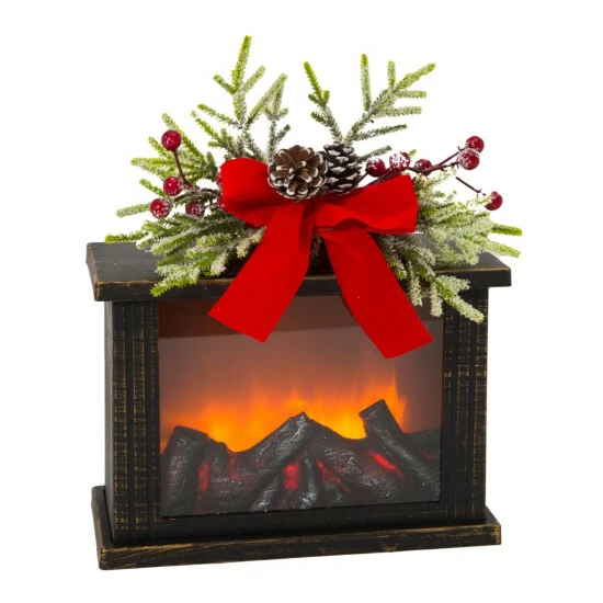 This 10.8-inch high Lighted Fire Glow Lantern will bring a home and hearth feel to your Christmas decorations this year. This lantern is designed to resemble a real fireplace and features LED Lighted Fire Glow technology. The lantern is also topped with beautiful accents of pine branches, pine cones, bows and berries.