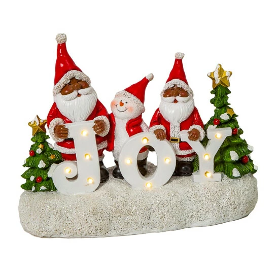 Bring some joy to the holidays this year with this 10-inch long Santa and Snowman Tabletop Sign featuring the word JOY! This tabletop sign has two Santas and a snowman next to two Christmas trees. The word JOY is illuminated with warm white LED lights to add some shine to the season.