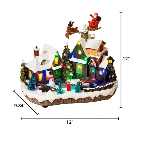 Delight your friends and add your own special touch to your holiday decorative style with this charming little holiday village scene. This exquisitely crafted piece is 12.4″ long and depicts 2 adorable houses with softly glowing, energy efficient LED lights in red, blue, yellow and green emanating from the windows and situated around the scene. There’s a lot going on in this tiny village, with Santa in his sleigh on one of the rooftops, a traditional snowman and 3 moving figurines enjoying the winter fun and pine trees in the background.