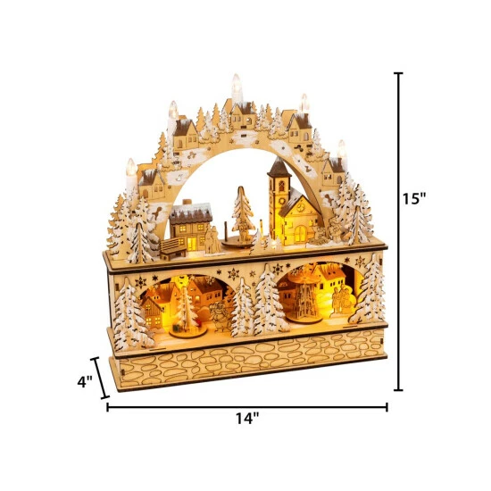 Everyone will delight in this 14.75″ lighted laser cut winter mountain village scene, with moving town centers. Exquisitely detailed, you will see something new to delight you every time you look at it. It truly replicates an old German Christmas decoration call a Schwibbogen, a decorative candle holder first made in the 1700’s.