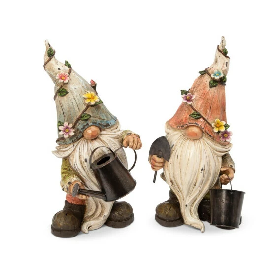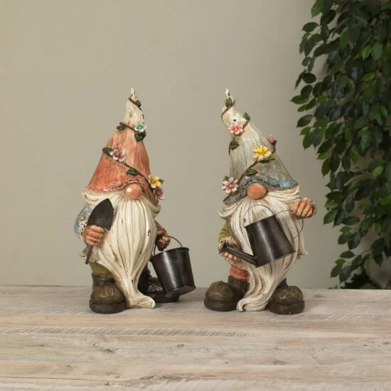 Invite a little fun and fancy into your garden this summer with this set of two 15.1″ tall assorted Resin Garden Gnome Figurines from The Gerson Company. Each gnome holds a watering pail and is ready to garden. Made from poly-resin, their details are remarkable, and they will stand sturdy on any flat surface.
