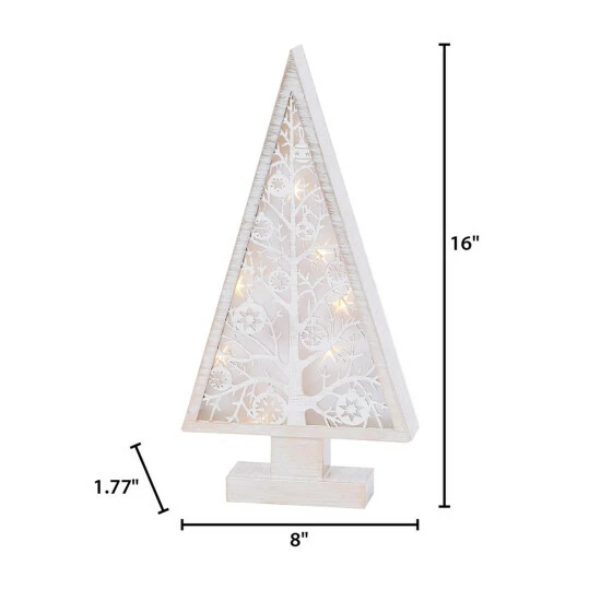 This battery-operated 16-inch high whitewashed wood framed laser cut tree with branches and ornaments is gently backlit by warm white led lights, giving it a shadowbox effect. With rustic hand hewn woodwork, this tree will bring a sense of calming holiday spirit over all who see it. Requires 2 AA batteries (not included).