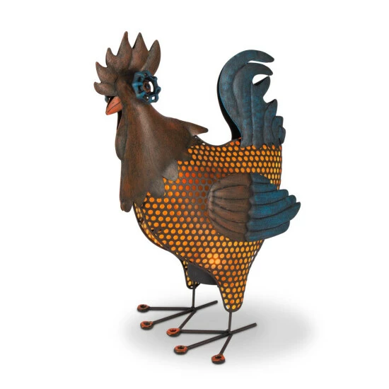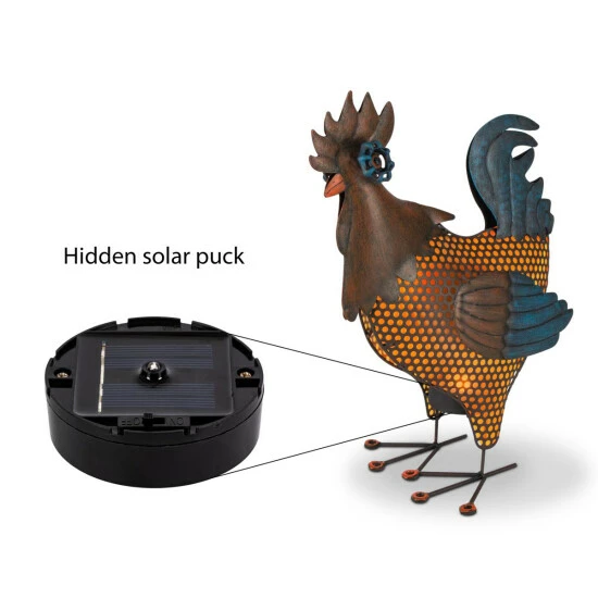 This Solar Burnished Rooster Statue stands 17.72″ tall and is illuminated by an orange LED light that will come on as the sun goes down. Detailed scroll metal work gives this garden and yard dΓ©cor an authentic look with illuminated cut-outs and rustic brown and blue finish.This rooster will make an great addition to your modern farm decor, standing alone, or illuminating a grouping at night to the delight of friends and neighbors. Place the statue in direct sunlight for the optimal charge throughout the day.