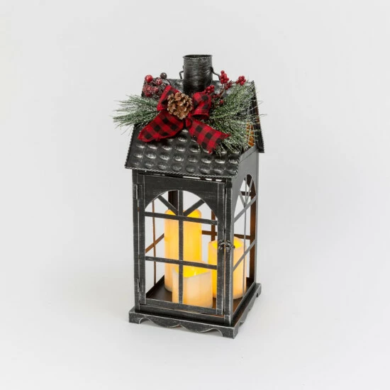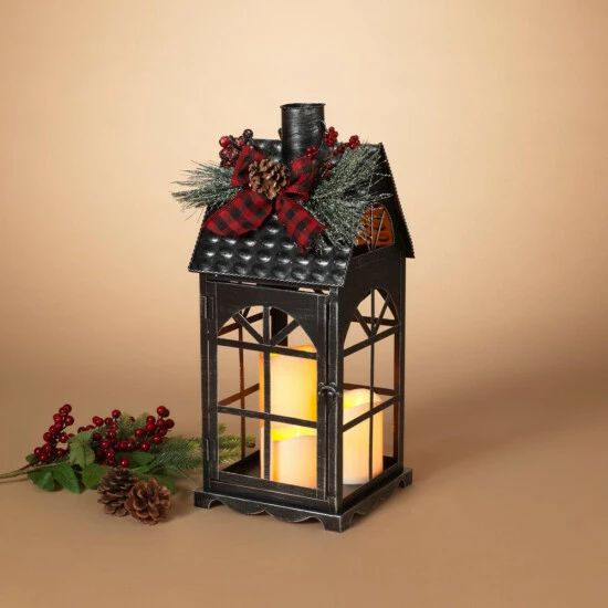 There is just something about the warm glow of candles in a old fashioned metal lantern. Topped with a plaid bow, pine cone, and floral accent, this lantern brings a seasonal touch to your home.