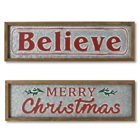 A pair of 26″ long old fashioned rustic wood framed metal Christmas wall signs add a touch of the past. Holiday greetings painted in red, white and green on textured antique silver galvanized metal add a perfect holiday touch. Two greetings, “Believe” and “Merry Christmas.”