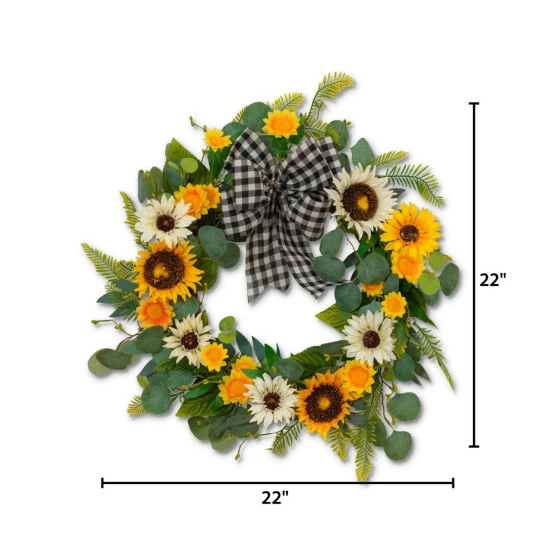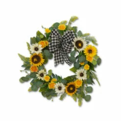 Bring the delight of a blooming garden into your own home with this stunning 22″ diameter Sunflower & Eucalyptus Wreath with black and white bow. Artfully-crafted with sunflowers and eucalyptus leaves and reinforced with metal wire, this beautiful wreath from The Gerson Company is perfect for spring but also ideal for year-round use.