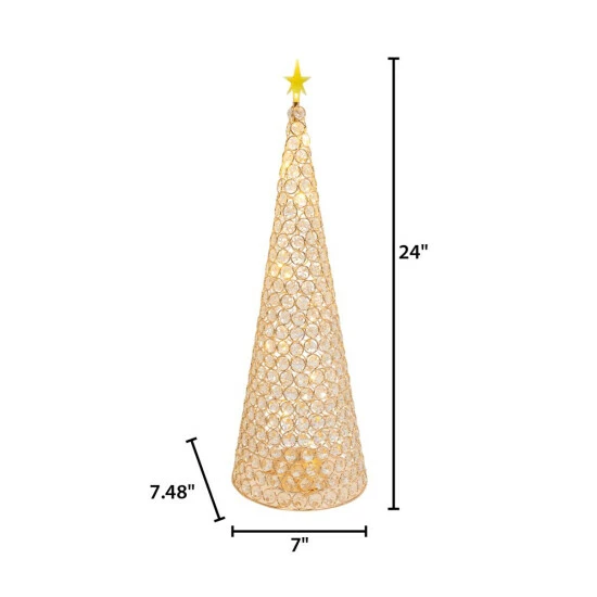 Add a touch of glistening class to your holiday dΓ©cor. This 23.8″ high gold frame crystals battery-operated lighted tree is stunning. This light string filed cone tree is topped off with a gold star, and makes an impressive display. Convenient 6 hour timer