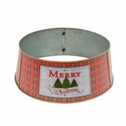 An old fashioned twist on a modern Christmas tree accessory! With this Buffalo plaid and ‘Merry Christmas’ painted galvanized 27.75-inch diameter x 10-inch high metal tree collar, you get full base coverage and can make a decorative statement. This tree collar is a chic, unfussy way to cover that clunky base.