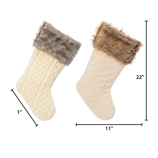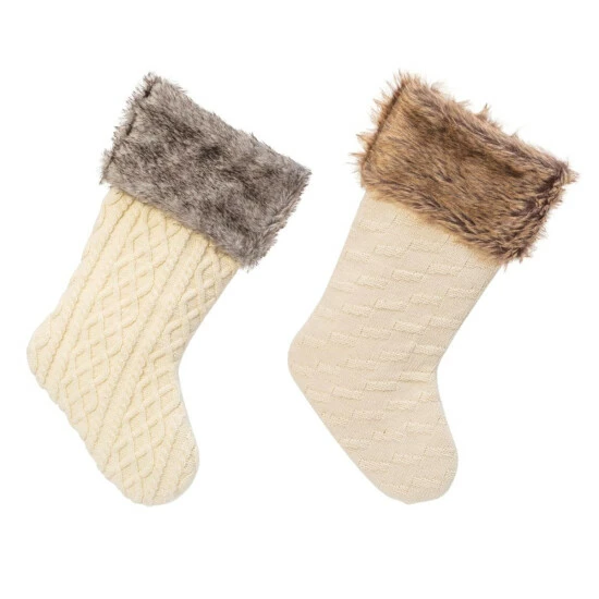 Add the feel of warmth with this pair of 21″ high classically beautiful white cable knit with faux fur trim top Christmas stockings. Two styles of cable knit patterns, these stocking look so warm and snuggly you will want to put them on. These stockings will look great hanging on your mantel. Two colors faux fir, brown and gray.