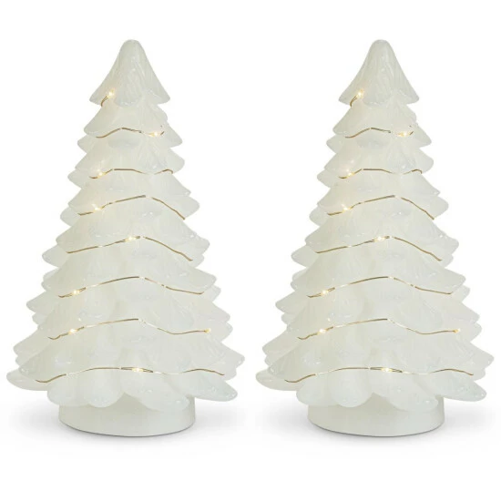 A set of two 9.05-inch high battery-operated lighted vintage white wax Christmas trees is just what you need to get you in the holiday spirit. Wrapped with cool white LED light strings, this pair is captivating. Requires 4 AA batteries (not included). Convenient 5 hour timer.