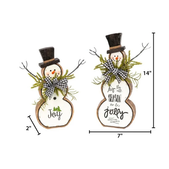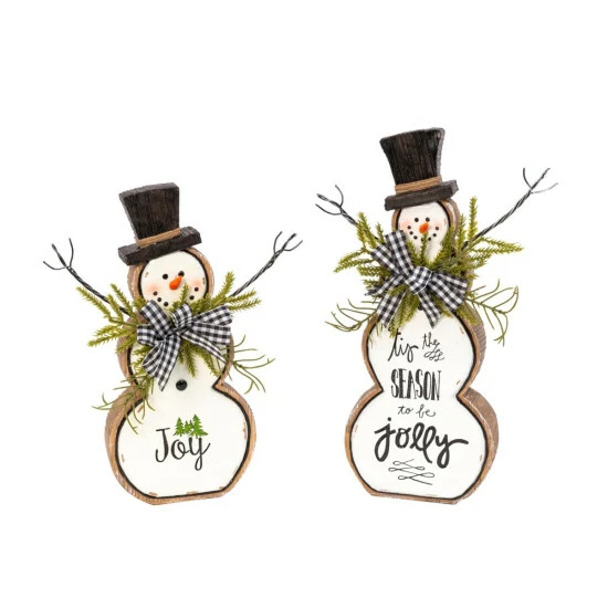 This rustically handcrafted wood look set of two snowmen of resin, stone and metal will add just the right touch to your Christmas holiday dΓ©cor. With their top hats, black and white bow scarves and a touch of winter greenery, they will make you smile. Holiday messages say ‘Tis the Season to be Jolly’ and Joy.’