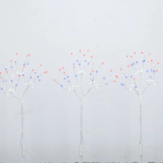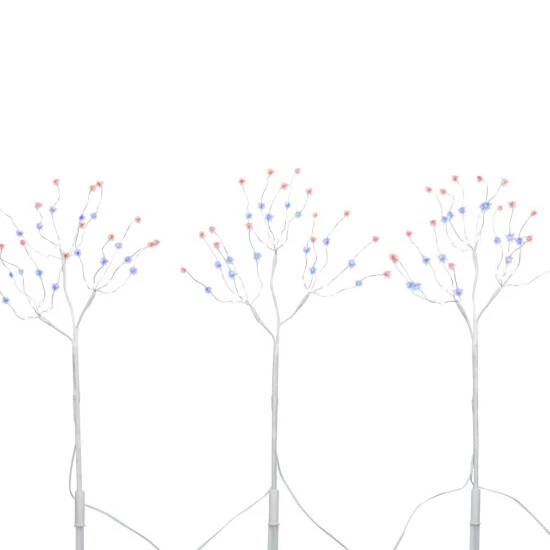 This set of 3 connected 19.68″ H white branch stakes are the perfect patriotic accent for any yard. Each branch has a firework effect with 45 red, white and blue LED lights (135 lights total). The three branches are connected by a white wire with 19.5″ spacing that includes an outdoor battery box with a 6 ON /18 OFF timer function.