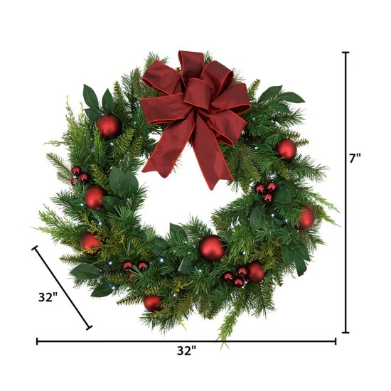 No Christmas decorating is complete without the tradition of displaying a beautiful wreath to announce the holidays and welcome guests into your home, and this 32-inch battery-operated 50 cool white light wreath is breathtaking. Many layers of cedar branches are crafted with eye catching frosted red balls, and a matching top bow to add a brilliant pop of color. Ready to be hung on your door, wall or fireplace, this cedar wreath will instantly spruce up your holiday décor and add a hearth-and-home feel.