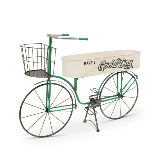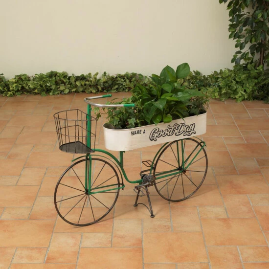 Take your favorite potted plants and flowers for a ride on this antique-styled, 37.2″L Bicycle Planter from The Gerson Company. Durably-constructed of metal in a classic, antique-styled bicycle design, this charming plant stand has spoked wheels and a striking green finish with a white basket. With a planting tray accented with “Have a Good Day”, as well as two holders for potted plants or live flowers, you can create a dazzling display. Intended for use outdoors, this cleverly-designed bicycle planter would make the delightful addition to your summer garden, or the perfect accent piece for your patio.