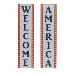 This set of 47.2″ high antique-styled wooden patriotic wall hangings will cheer up any space for the Fourth of July. Perfect for hanging or freestanding with easel back. This set includes two wall hangings, one saying ‘Welcome’ and the other saying ‘America’ accented by LED lit stars along the side. They can be displayed together or separately, indoors or on a porch or patio. Each is battery operated by 2 AA batteries, sold separately. You won’t be able to wait to break out these wall hangings to celebrate Independence Day.