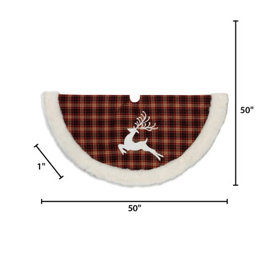 Add some warmth and homey charm to your Christmas tree! With a white deer and trimmed in grey faux fur, this 48-inch diameter holiday plaid tree skirt will show off your tree in rustic yet modern fashion. This warm holiday plaid is a classic, and the reindeer applique adds the perfect holiday touch.