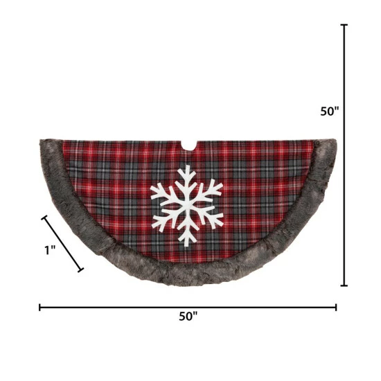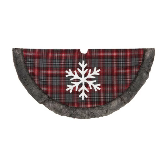 Add some warmth and homey charm to your Christmas tree. With a white snowflake and trimmed in gray faux fur, this 48-inch diameter holiday plaid tree skirt will show off your tree in rustic yet modern fashion. This warm holiday plaid is a classic, and the reindeer applique adds the perfect holiday touch.