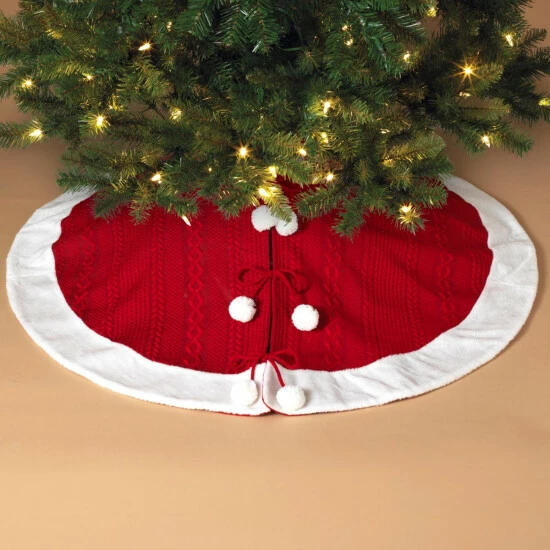 This cheerful 48″ diameter red cable knit tree skirt with white faux fur trim will pop under your tree. There the circle comes together, there are three red ribbon bows with pompom accents, making it look like a warm winter cape. A perfect background for your presents!
