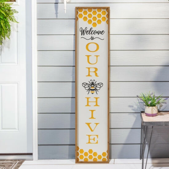 Bring some sweetness to your Springtime decorations with this Honey-Bee themed engraved sign. This sign features a Honeycomb design, a Honey-Bee and the phrase “Welcome to Our Hive” written down the middle of the sign. Measuring 48″ tall, this sign makes a perfect decoration for the front porch or the entryway of your home.
