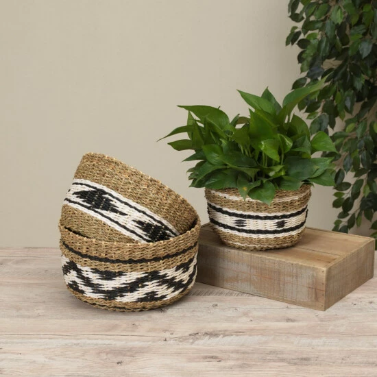 These beautifully patterned decorative basket are woven in striking patterns. Woven from natural seagrass rope and paper rope. Use to display your favorite faux greens or flowers. Fill with decorative items, add string lights, the possibilities are unlimited.