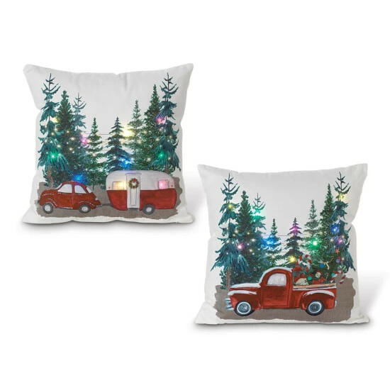 Over the river and through the woods, to Grandmother’s house we go! This set of 2 fabric 16-inch square pillows feature two different styles of antique red trucks, one with a camper, with battery-operated multicolor lights on the greenery. They are a fun and festive way to add a little holiday charm wherever placed. Makes great gifts! Each pillow requires 2 AA batteries (not included) and has a 6 hour timer.