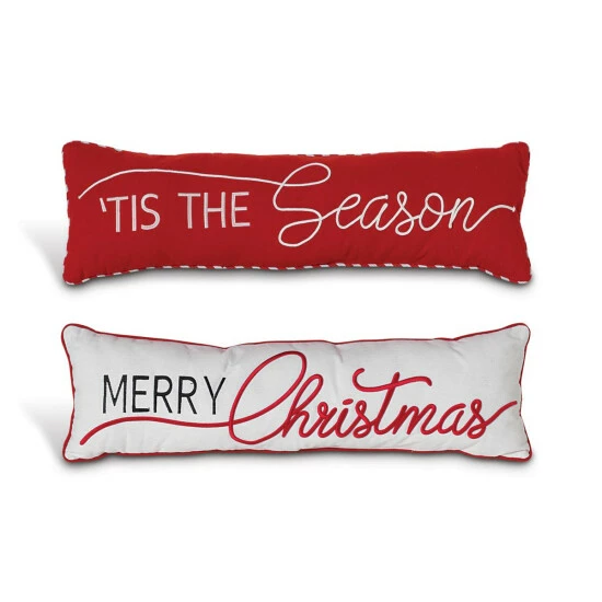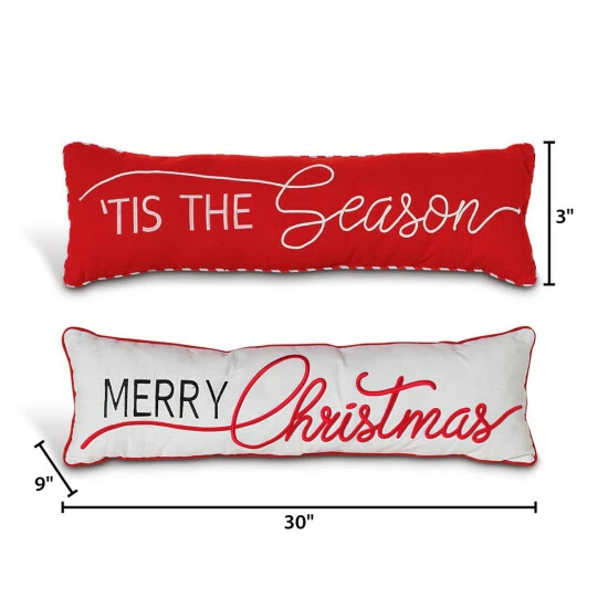 This set of two 30-inch long rectangular lumbar pillows with red trim comes in two colors: red with white “‘Tis the Season” embroidering and ivory with green and red “Merry Christmas” greetings. These festive and classic pillows will accent any style dΓ©cor while bringing holiday cheer.