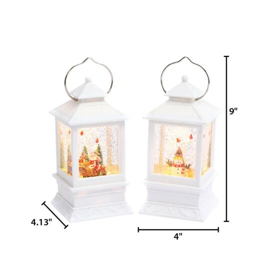 Delight while watching this set of 2 battery-operated lighted 8.75-inch high white lanterns with gently swirling glittering water around beautiful cardinals, trees and Christmas figures. Two holiday styles, Santa and a snowman. Each featuring a 6-hour timer. Each lantern requires 3 AA batteries (not included).